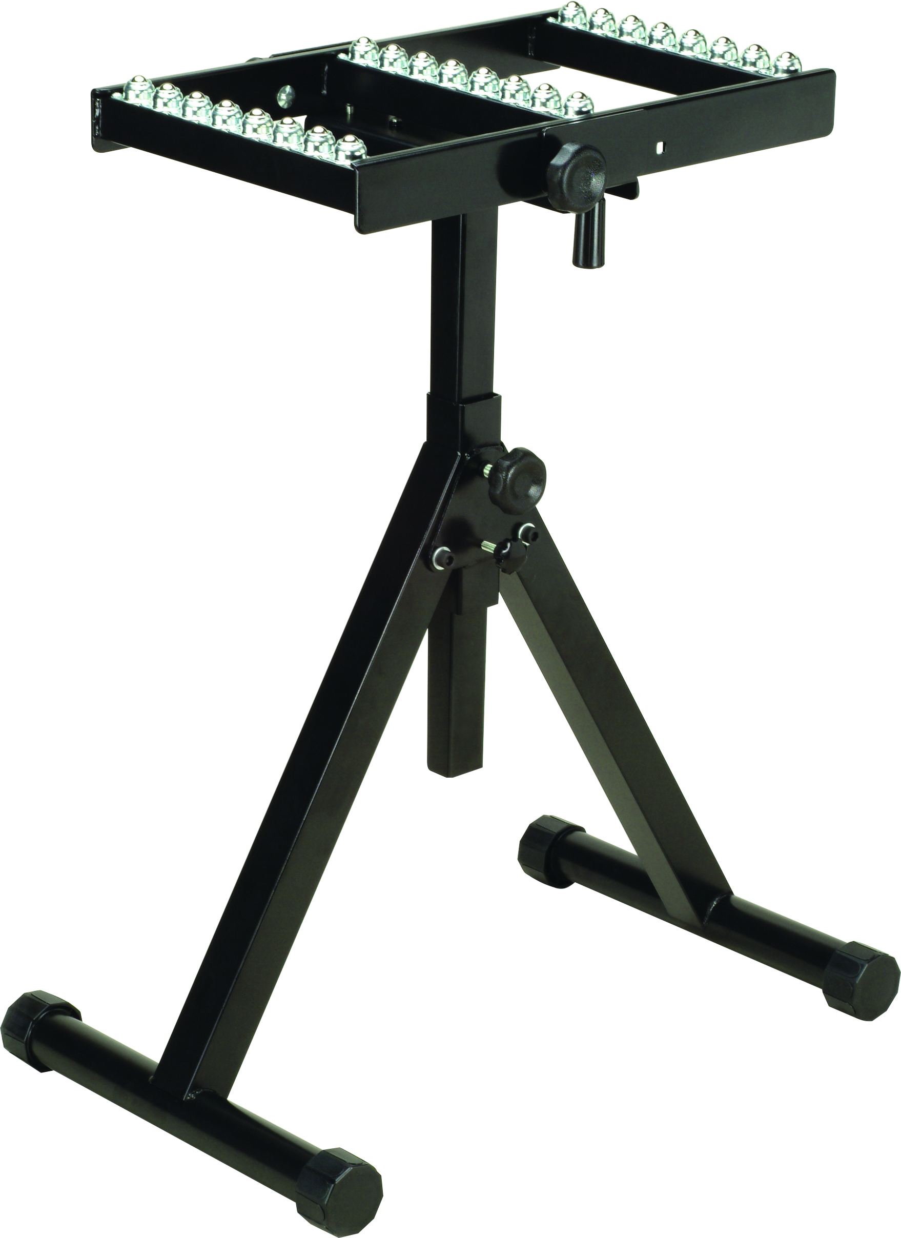 stufenlos höhenverstellbar, dreh- und arretierbar, mit pneumatischer Absenkdämpfung, Auflagerolle aus Stahlrohr Ø 60 mm, Schwerkraftanschläge seitlich 20 mm über Oberkante Rolle (drehen sich bei breiten Werkstücken weg), 4 Lenkrollen mit Feststeller