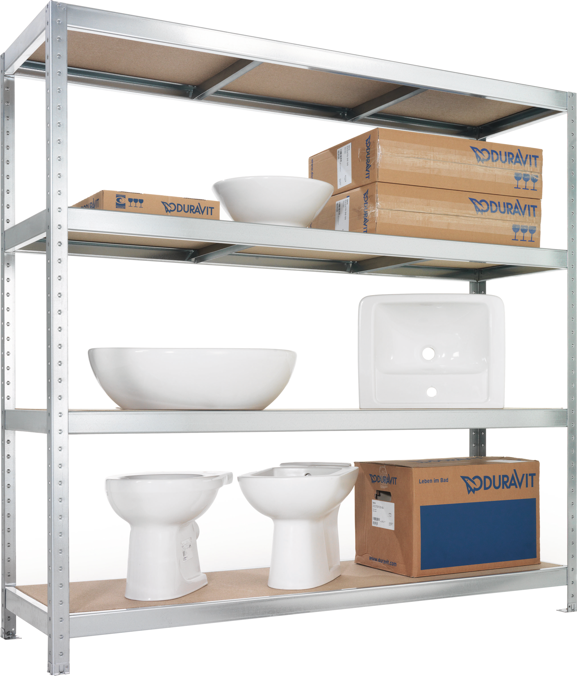 Grundregal mit Spanplattenböden für sperrige Güter, Fachebenen höhenverstellbar im Raster 50 mm, Böden liegen auf 4 Holmen auf, 2 Unterzüge unter jedem Boden, Bodenverankerung möglich, Stahlpaneelboden auf Anfrage möglich