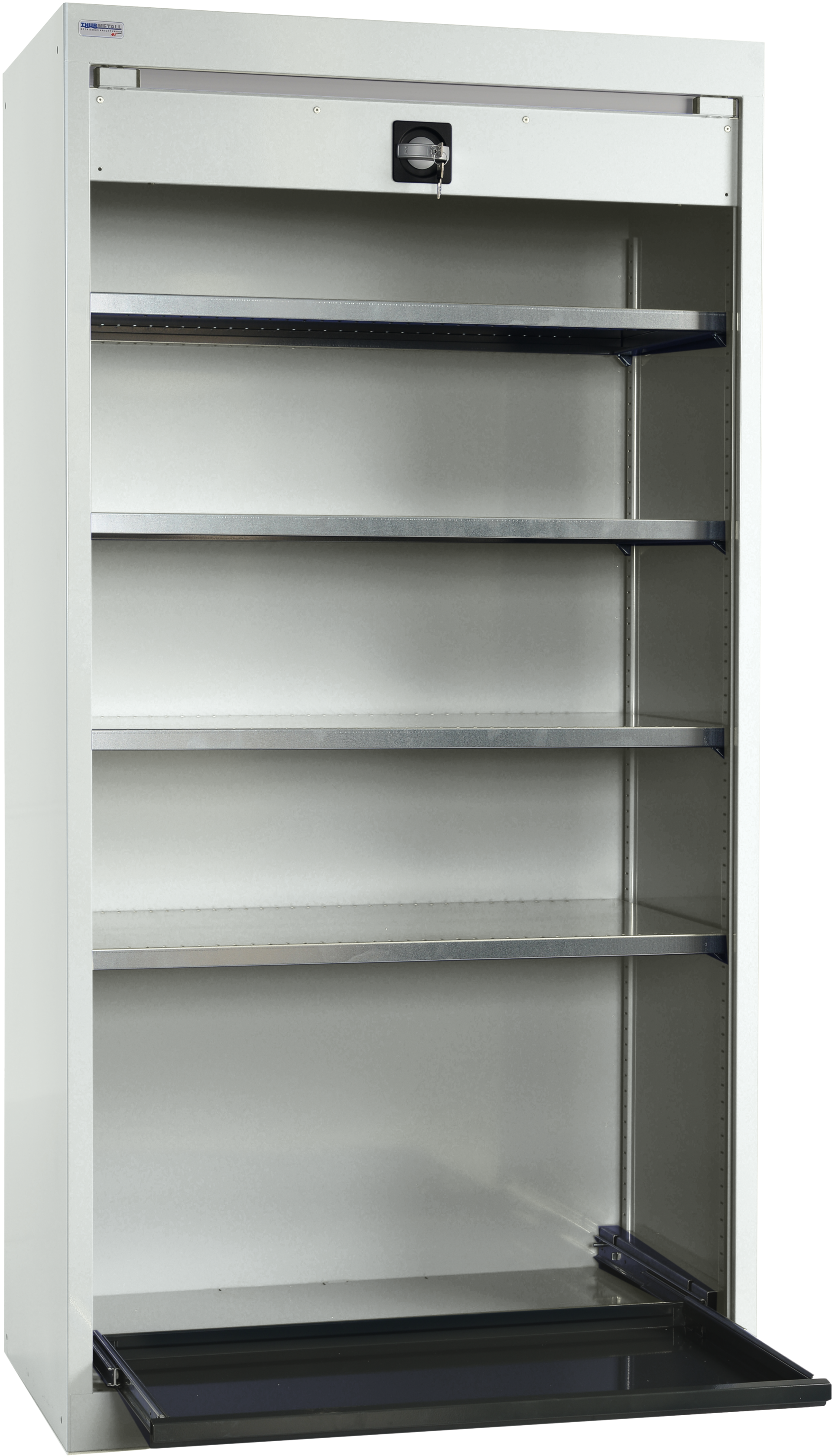 - verschließbar ohne Türen, Rollladen läuft an der Rückseite des Schrankes entlang, um den kompletten Raum des Schrankes ausnutzen zu können - Kunststofflamellen in grau (ähnlich RAL 7035) - Schublade bzw. Auszugsboden in RAL 7016 anthrazitgrau - verzinkte Einlegeböden - Muldengriffschloss mit zwei Schlüsseln