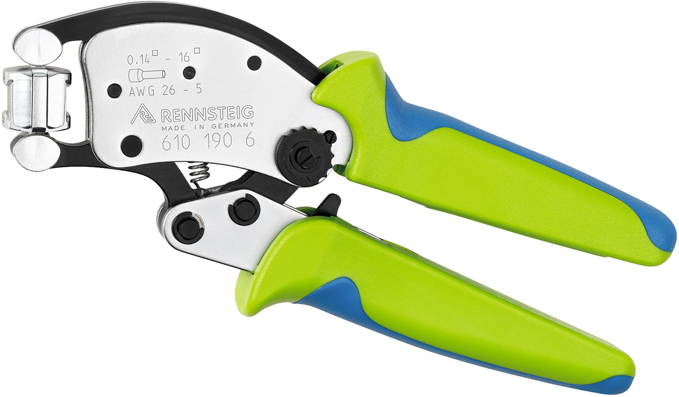 verchromt, automatische Einstellung auf den gewünschten Crimpquerschnitt, Vercrimpen von überlangen Aderendhülsen bis 16 mm in einem Arbeitsgang möglich, Vierkantcrimp