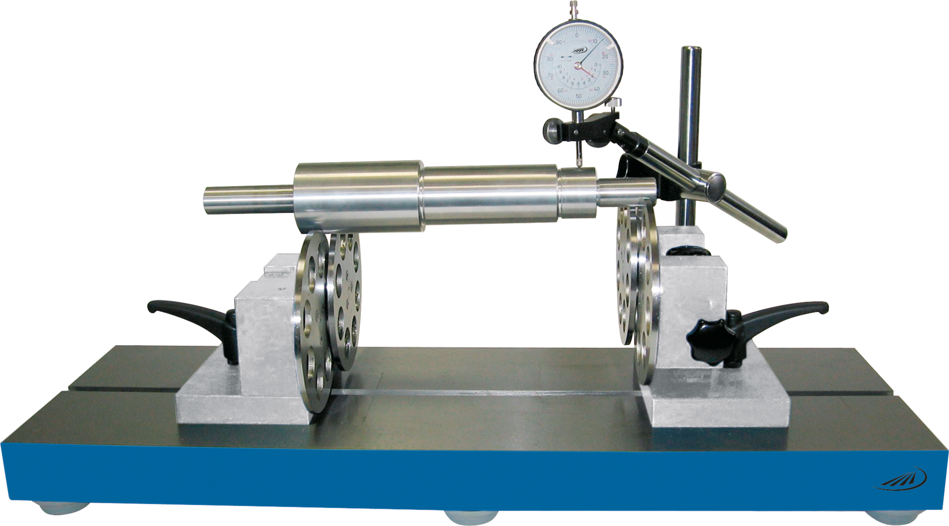 mit spielfrei gelagerten Abrollscheiben, die Scheibenböcke sind auf der Grundplatte verschiebbar, der Rollenbock kann zum Durchmesserausgleich 30 mm in der Höhe verstellt werden, Lieferung ohne MessuhrLieferumfang:Rundlaufprüfgerät, 2 Scheibenböcke und Messstativ