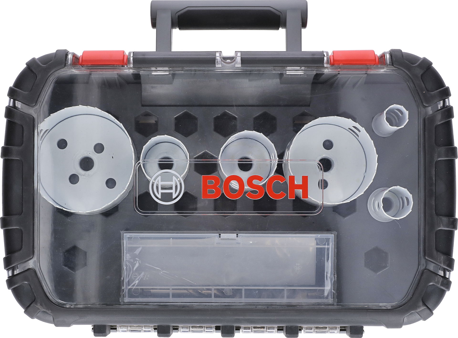 je 1 Bi-Metall-Lochsäge Ø 19 - 25 - 38 - 44 - 68 - 83 mm und Power-Change-Adapter mit Zentrierbohrer und Koffer