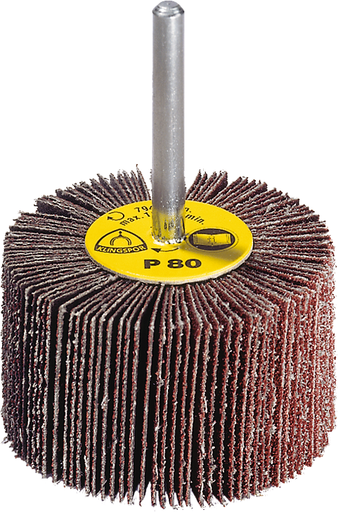 Korund mit Lamellen in Kunstharzbindung bestückt, mit 6 mm Spannschaft, die Lamellen passen sich den Konturen der zu bearbeitenden Werkstücke an