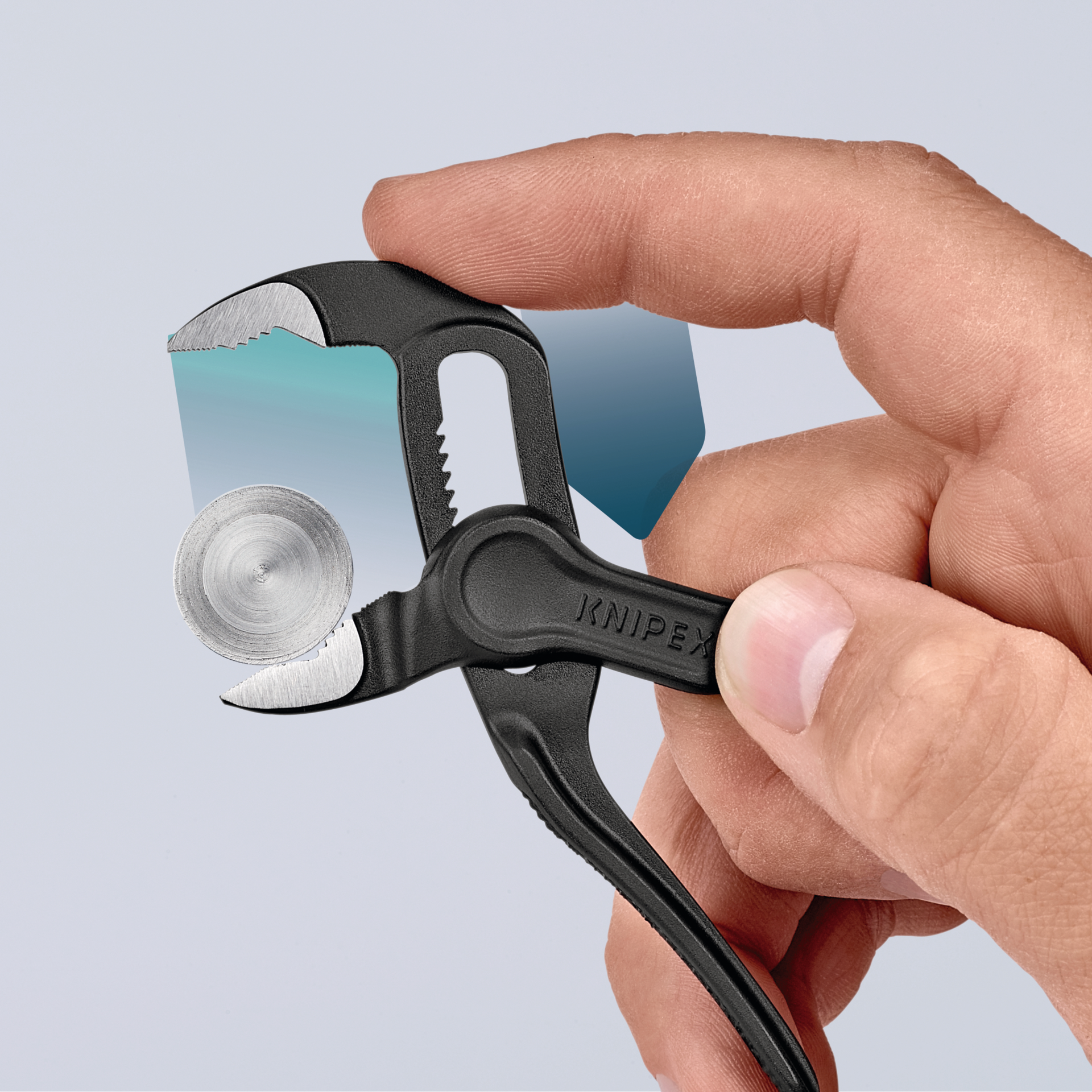 "die kleinste vollfunktionsfähige Wasserpumpenzange der Welt", Feineinstellung ermöglicht optimale Anpassung an verschiedenste Werkstückgrößen, keine unbeabsichtigte Verstellung durch sicheres Einrasten des Gelenkbolzens, Einhandverstellung, sehrschlanker Kopf