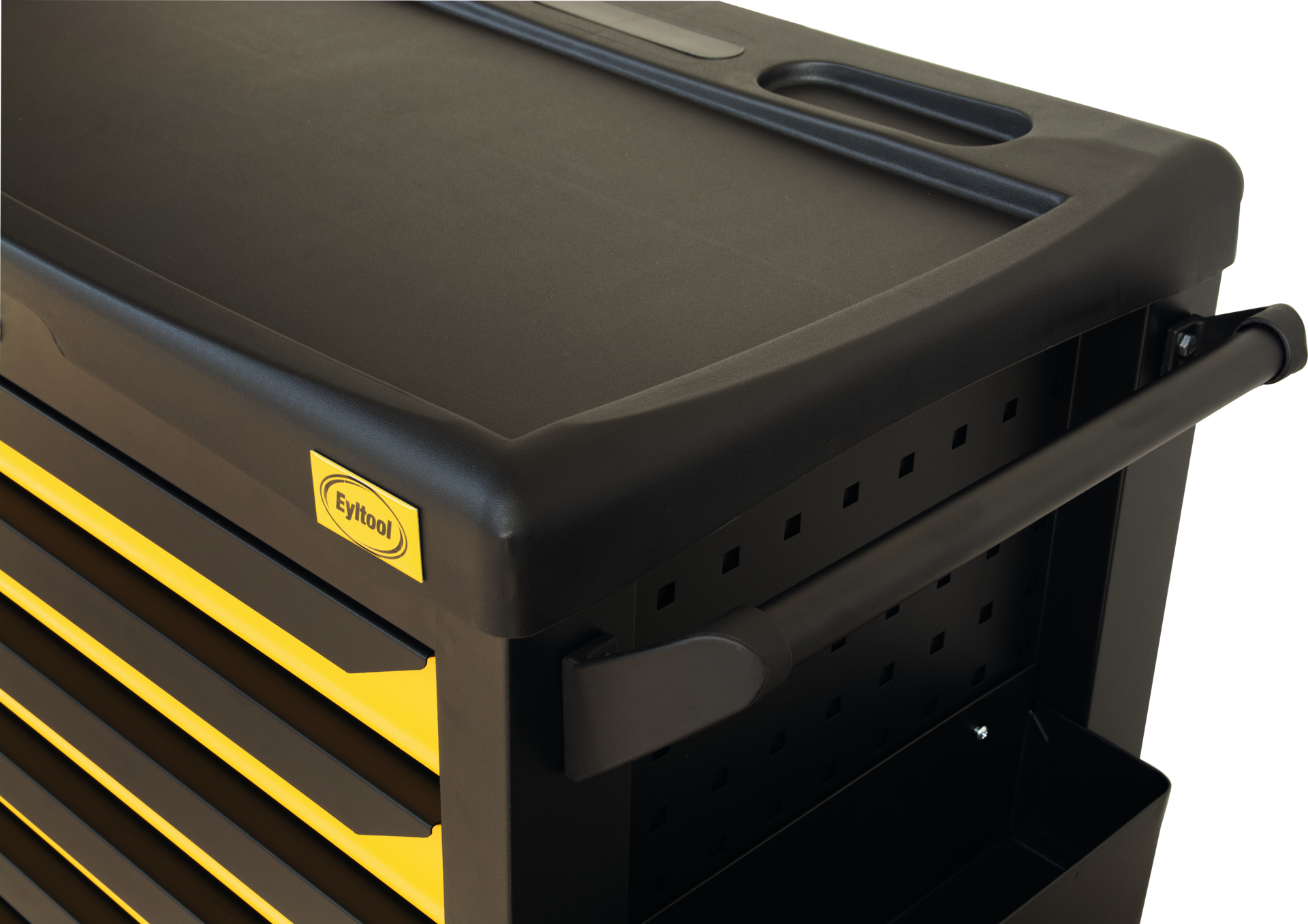 kippsicher, da sich immer nur eine Schublade öffnen lässt, matt pulverbeschichtet, kugelgelagerte Schubladenauszüge mit Rückstellmechanismus für sanftes Öffnen und Schließen, Schubladen mit 100%-igem Auszug, Griffleiste aus Stahl, abschließbar, 4 stabile extra große Spezialkunststoffrollen (Ø 120 mm, 2 Bock- und 2 Lenkrollen mit Sicherheitsstopp), Fußfreiheit 170 mm, mit Kunststoffablagefläche mit Abrollrand, abgewinkelter Stahlschiebegriff (beidseitig montierbar), gelochte Seitenwände, Stoßschutzecken aus Kunststoff, Systemeinlagen sind bedingt öl- und chemiekalienbeständig durch eine versiegelte PE-Oberfläche