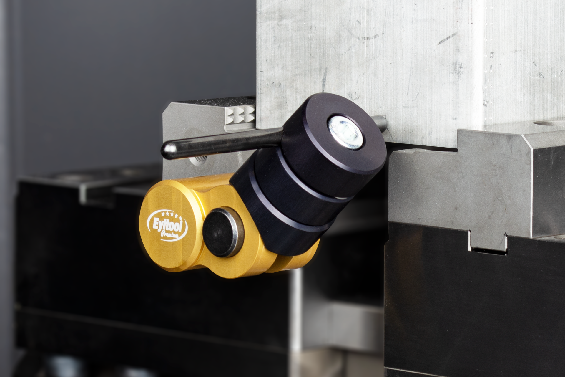 wird mittels Magnet beispielsweise direkt am Schraubstock angebracht, nach dem Spannen kann er einfach wieder abgenommen werden und gibt die Positionierfläche zur Bearbeitung frei, die Ausführung flexibel ist außerdem mit einer Schwenk- und Verdreheinrichtung ausgestattet und macht ein Positionieren an verschiedenen Stellen möglich