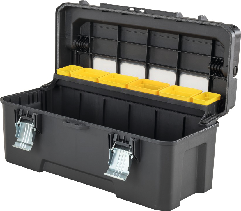 herausnehmbare Fächer für Kleinteile und längere Werkzeuge, langer Tragegriff aus Aluminium, rostfreie Metallschließen, durchsichtige Fenster im Deckel für sofortiges Erkennen des Inhalts, Cantilever-Trage ermöglicht Arbeiten auf 2 Ebenen, Dichtheit IP54 (Schutz vor Staubablagerung und Sprühwasser)