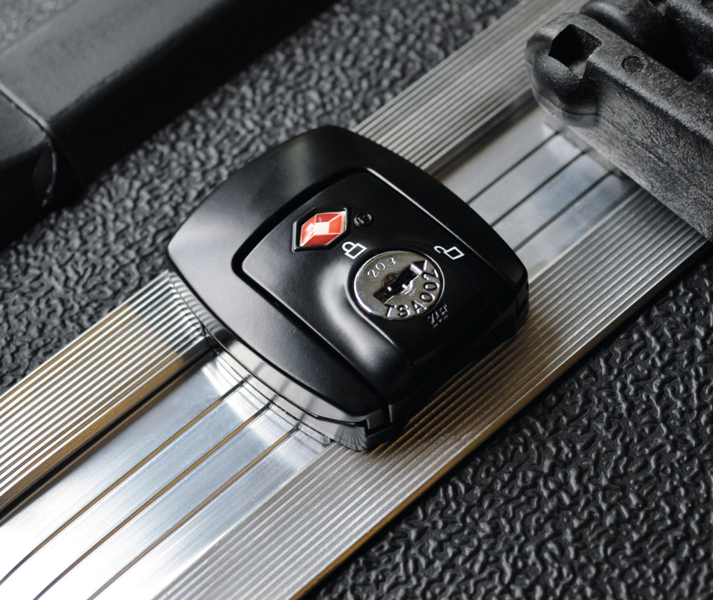 fahrbar, mit TSA Schloss (TSA-Schlösser können am Flughafen mit einem Generalschlüssel geöffnet werden, dies verhindert ein gewaltsames Öffnen bei der Zollabfertigung), mit robustem Aluminiumrahmen